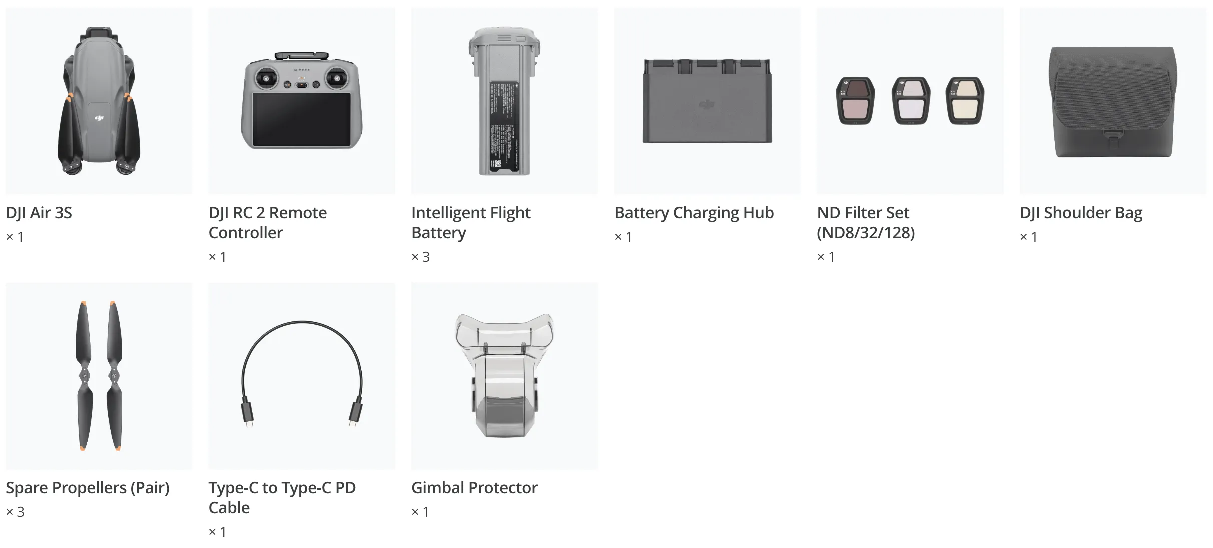 DJI Air 3S kommer i forskellige kombinationer med forskelligt tilbehør, der kan imødekomme alle dine behov.