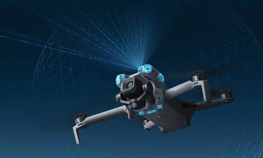 Udstyret med en fremadrettet LiDAR har Mini 5 Pro fisheye-linser på fronten og bagsiden til at registrere fremad, bagud, venstre, højre og opad. Bunden er udstyret med binokulære linser og en 3D infrarød sensor, der muliggør omnidirektionel forhindringsregistrering.