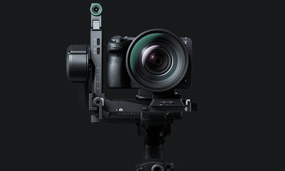 Skift hurtigt mellem gimbal og stativ med både Arca-Swiss-plade øverst og Manfrotto-plade nederst – uden at skulle balancere kameraet igen, fordi positionen huskes. Den øverste plade har desuden en justerbar føring, så kameraet monteres stabilt og sikkert.