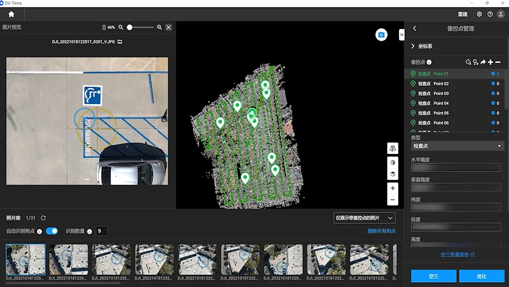 Med rekonstruktion i synligt lys kan du importere og markere kontrol- og tjekpunkter, så du får modeller og punktskyer, der passer præcist til virkeligheden. Terra gør markeringen hurtigere med semiautomatisk udpegning og automatisk genkendelse med subpixel-præcision, så du bruger mindre tid på manuelt arbejde og får mere ensartede resultater. Med tjekpunkter kan du løbende kontrollere nøjagtigheden undervejs, så du kan stole på dine data.
